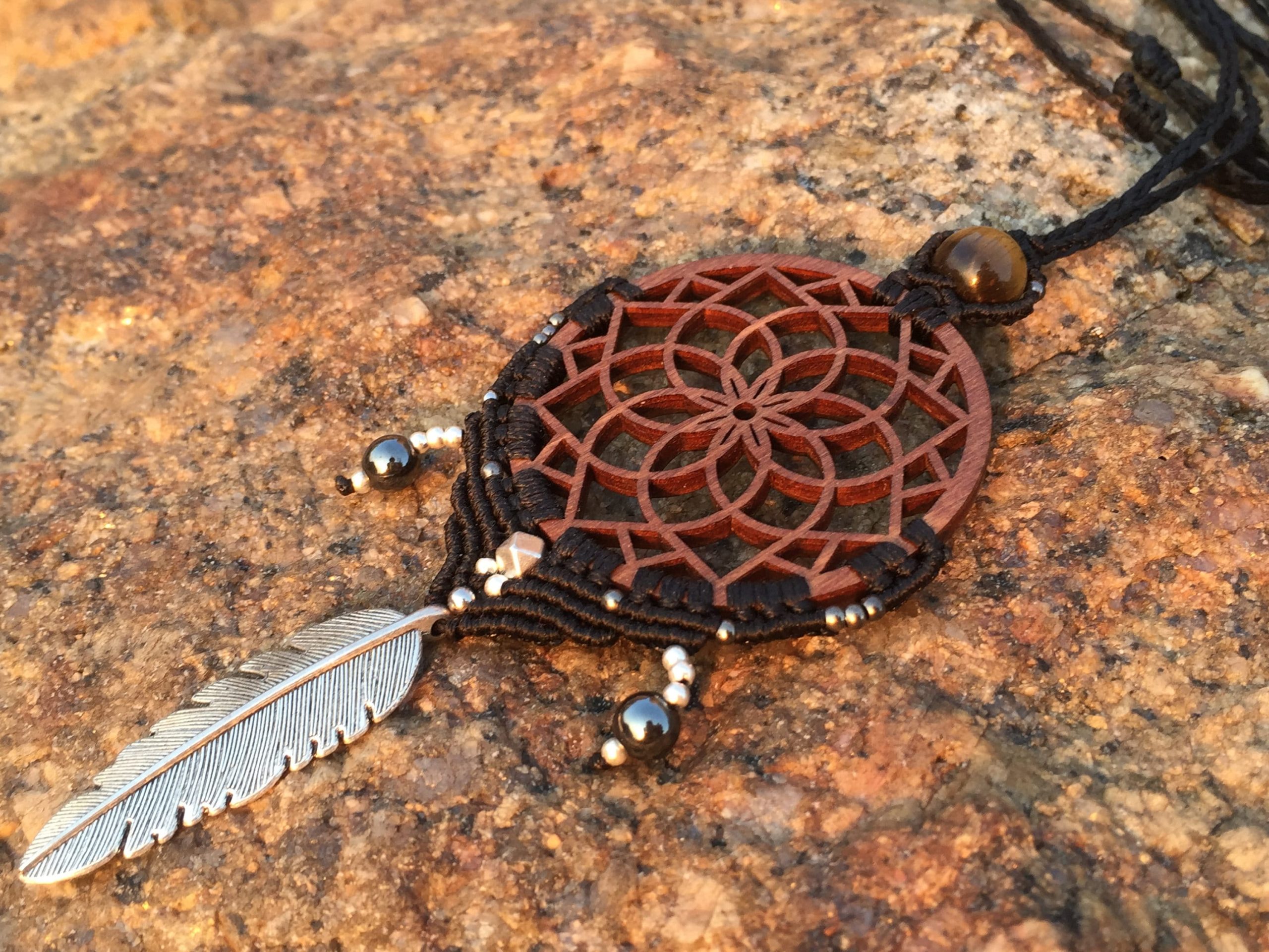 The Dream Catcher Necklace. It is macrame pendant with laser cut wooden base in the center and brass feathers and beads.