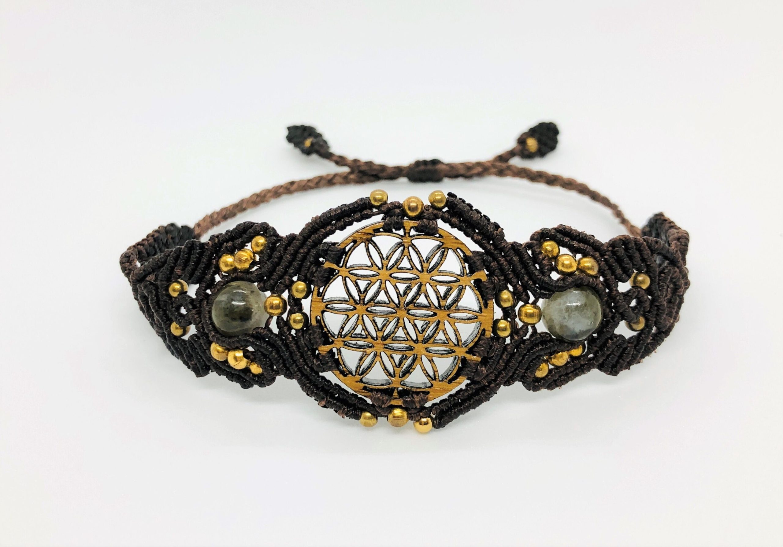 The macrame bracelet, skillfully handcrafted using durable and earthy-colored threads.