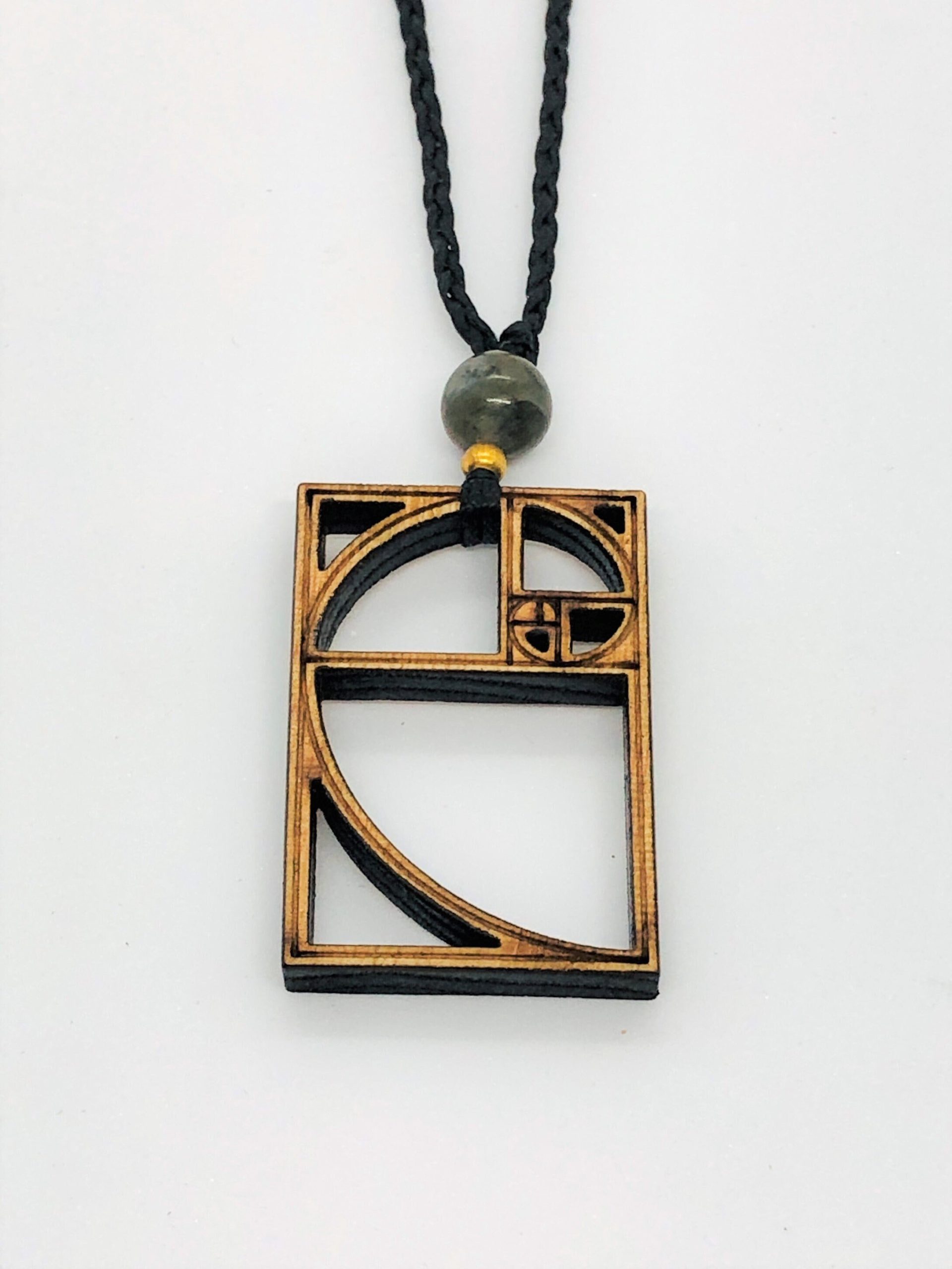 The pendant features a meticulously crafted wooden Fibonacci spiral, a mathematical pattern that is found throughout nature. The Fibonacci sequence is a series of numbers in which each number is the sum of the two preceding ones. This sequence creates a mesmerizing spiral shape that can be observed in the arrangement of flower petals, the branching of trees, and the spiraling of seashells.