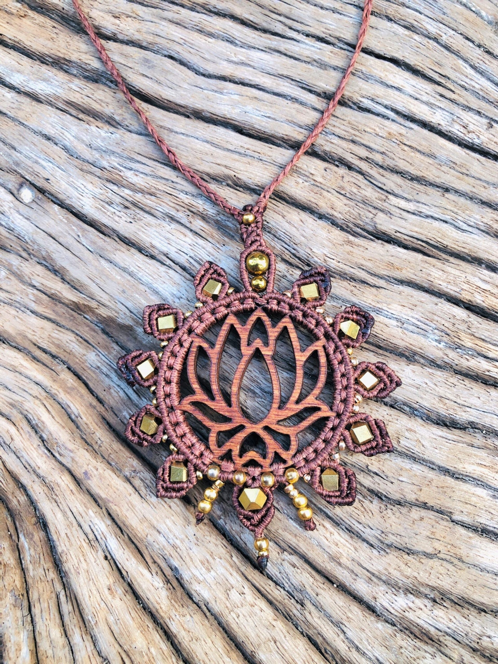 Lotus Flower Yoga Necklace, Macrame Bohemian White Necklace Yoga Meditation Necklace Wooden Laser cut Pendant, Gift for her, Spiritual gift