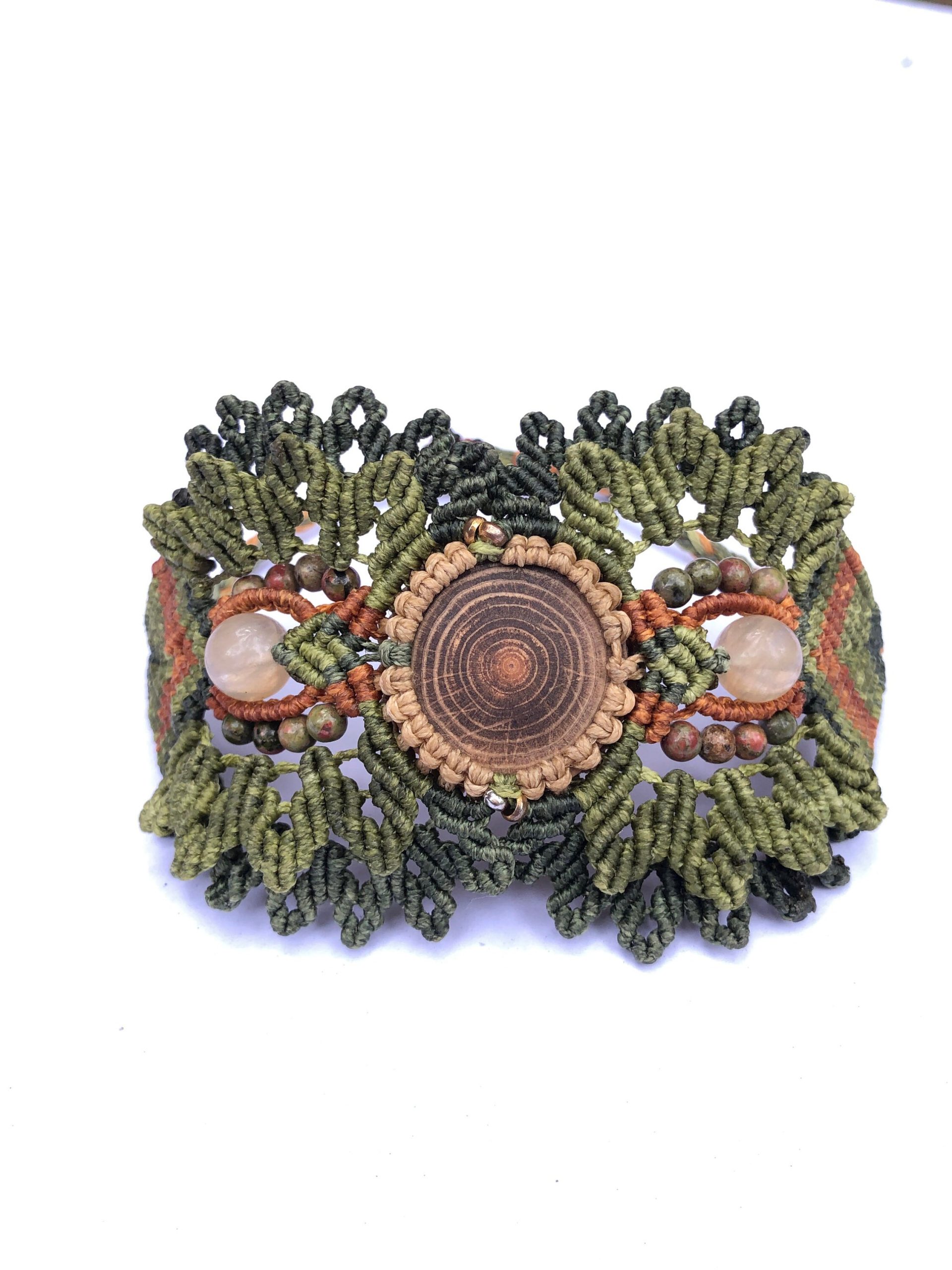 Materials : pine wood, waxed makrame threads, natural crystals – UNAKITE and CITRINE