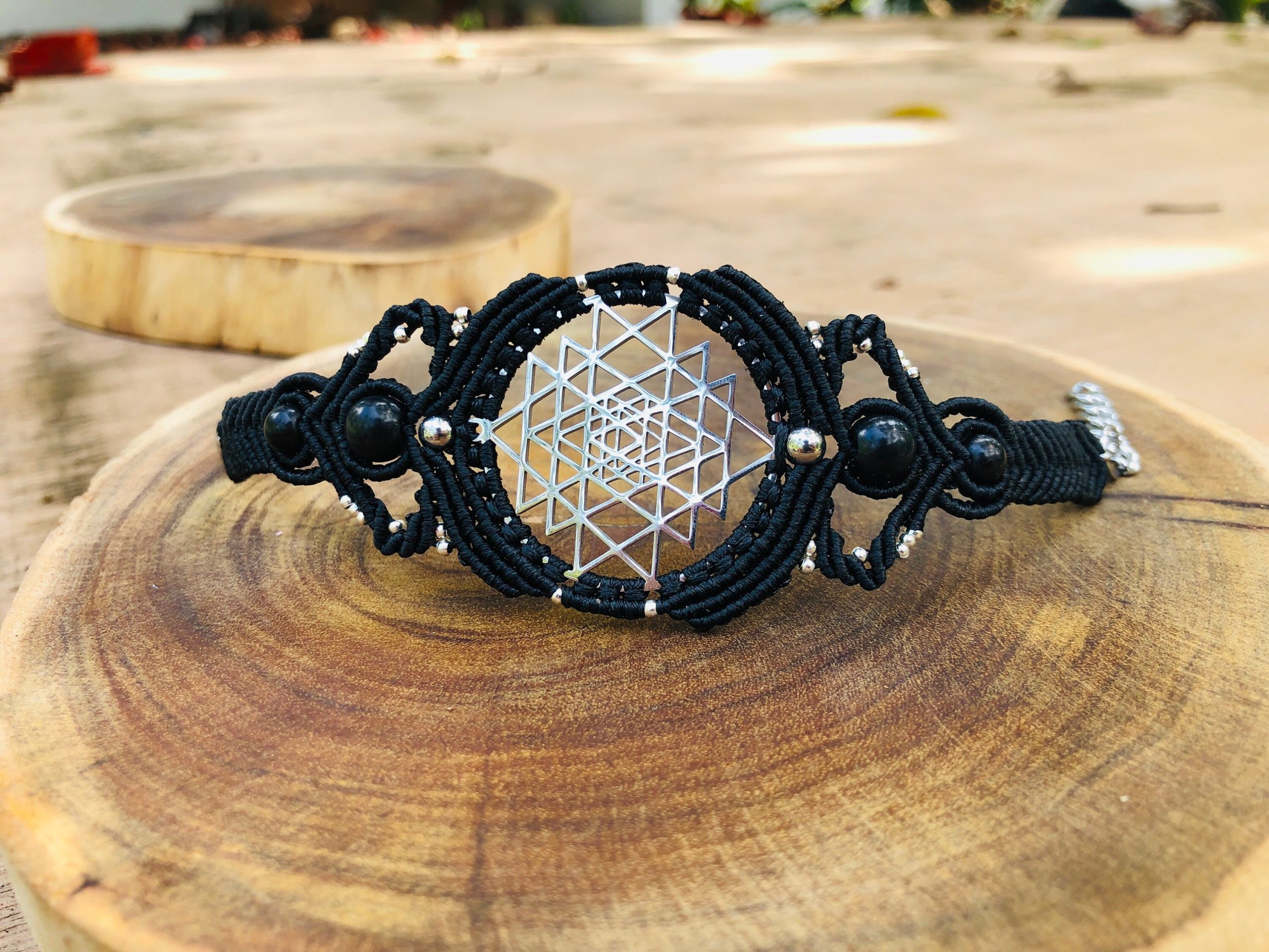 Organic macramé threads, stainless steel beads, chain and lobster claw lock used.