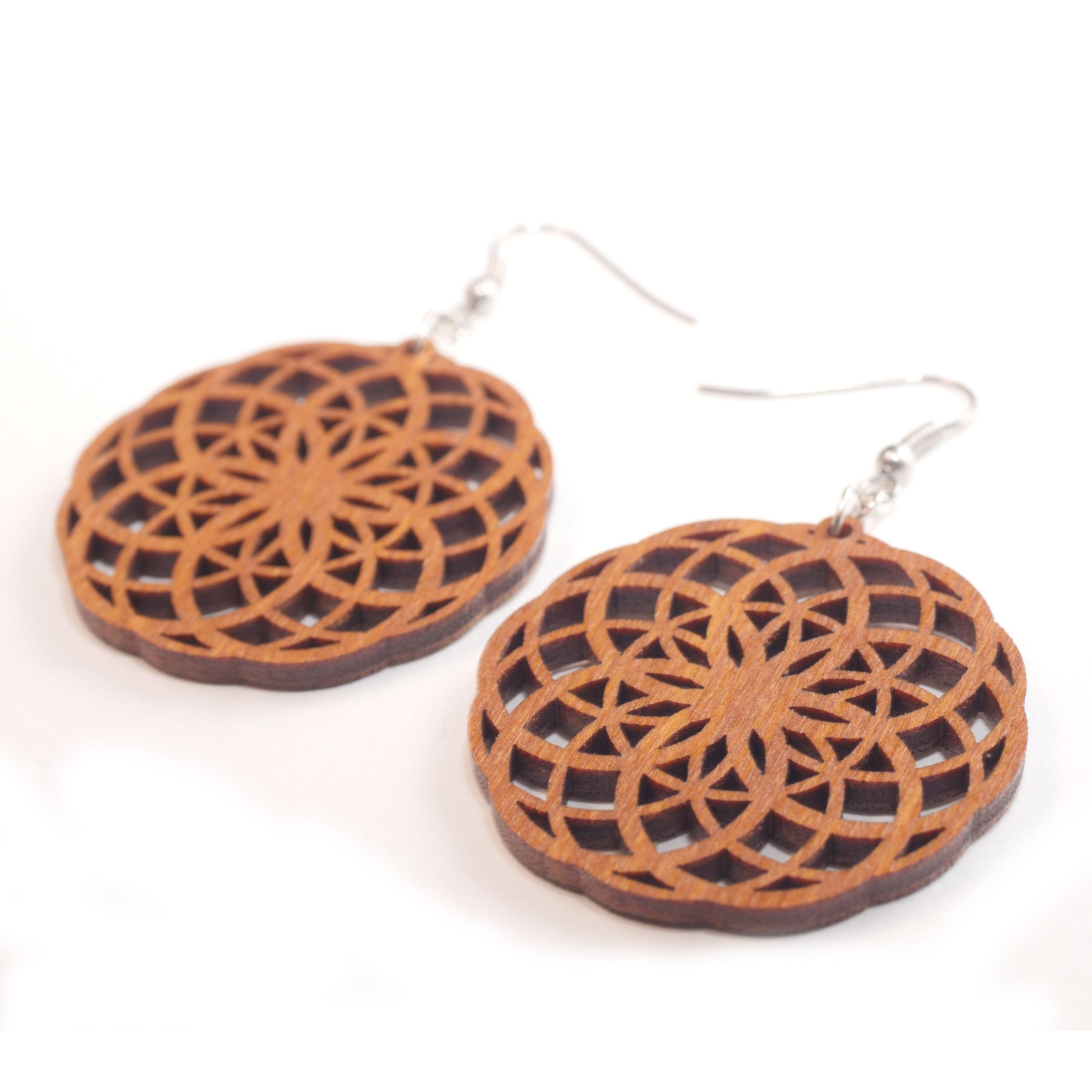 These earrings feature wooden discs meticulously crafted and shaped into a circular form, reminiscent of the torus, a sacred geometric shape. The torus is a three-dimensional shape that represents energy flow, balance, and wholeness. It is often associated with harmonious energy patterns found in nature.
