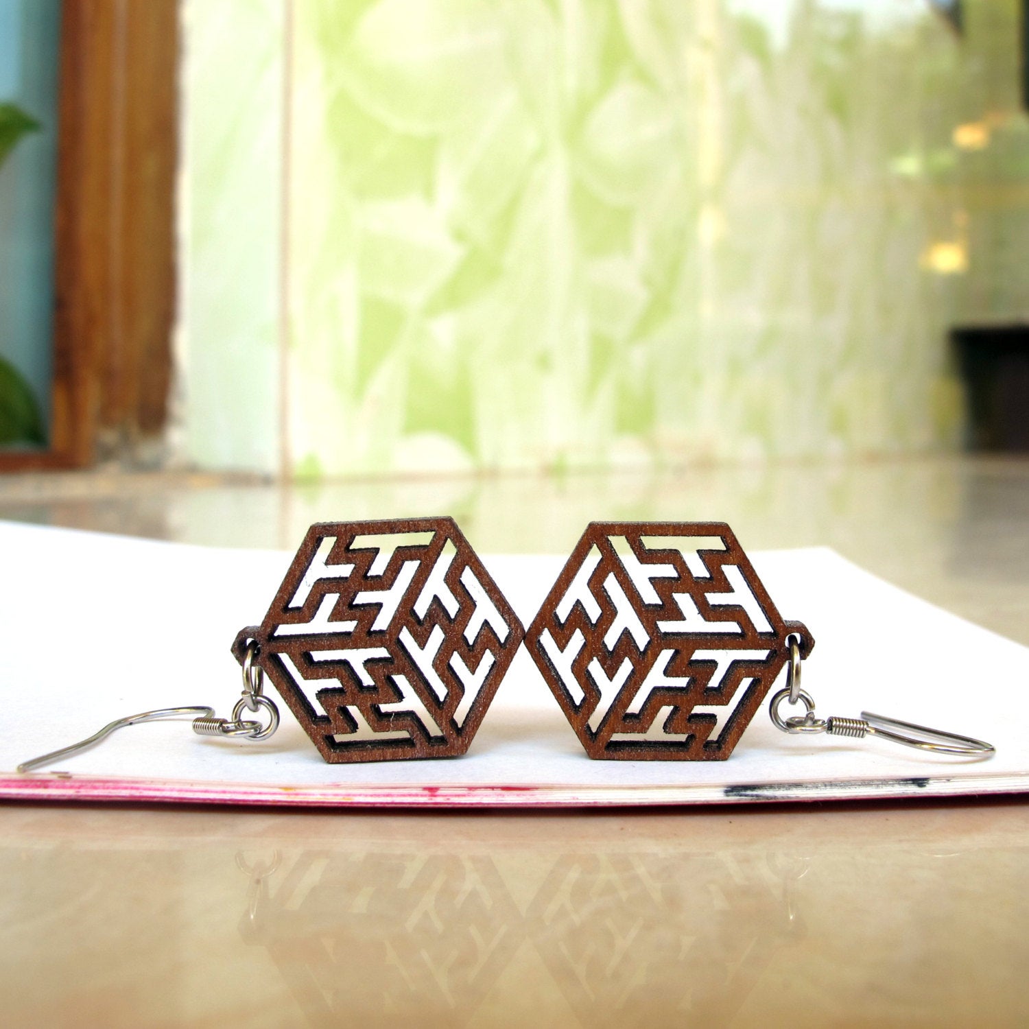 Please note that the specific appearance and design of the Wooden Earrings featuring the cube pattern may vary, as they are often handcrafted by skilled artisans who incorporate their own unique styles and interpretations.