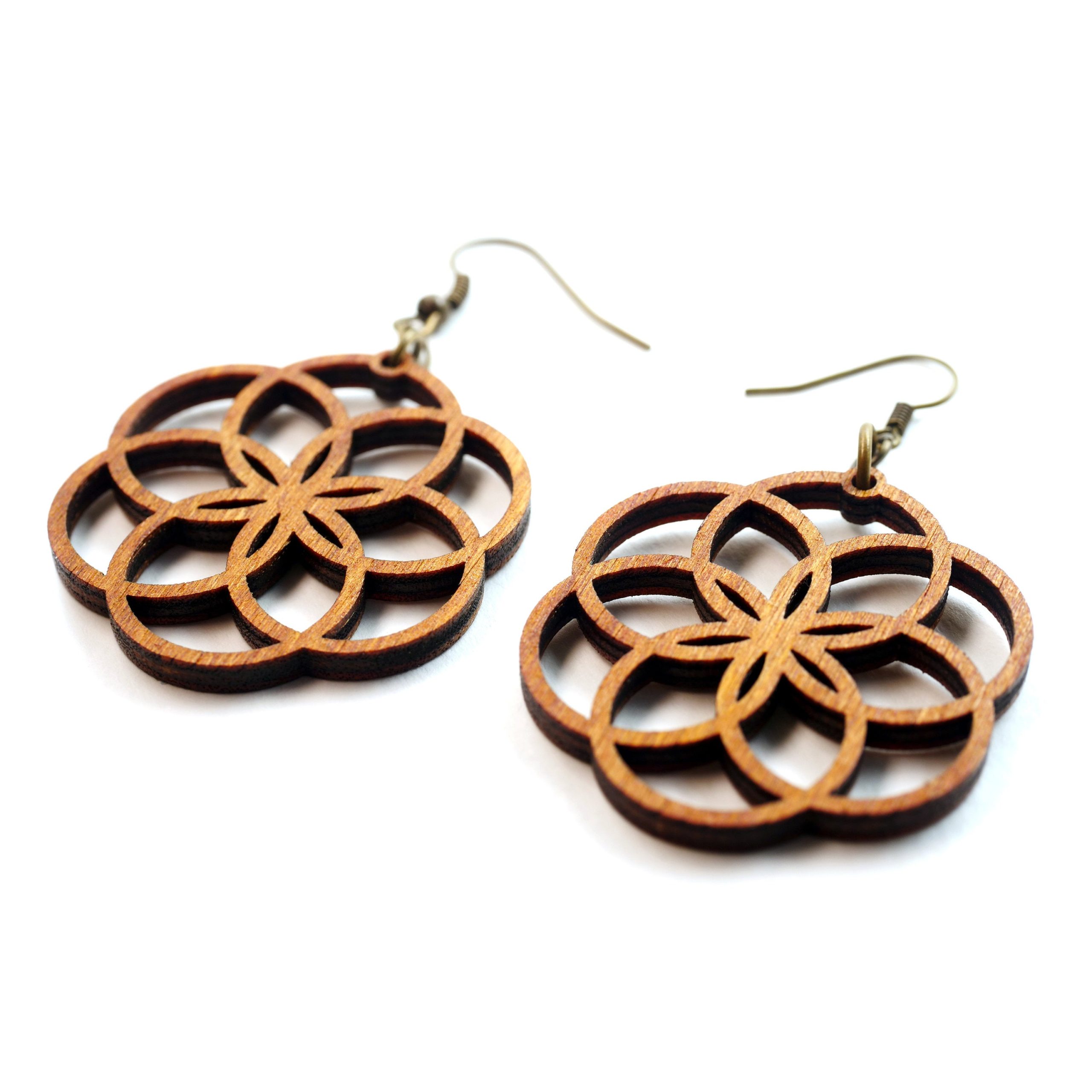 Yoga Lotus Earrings, hook on a leaf, Wooden earings, Seed of Life, Sacred Geometry Wood Jewelry, Bohemian earrings, Circle laser cut earings